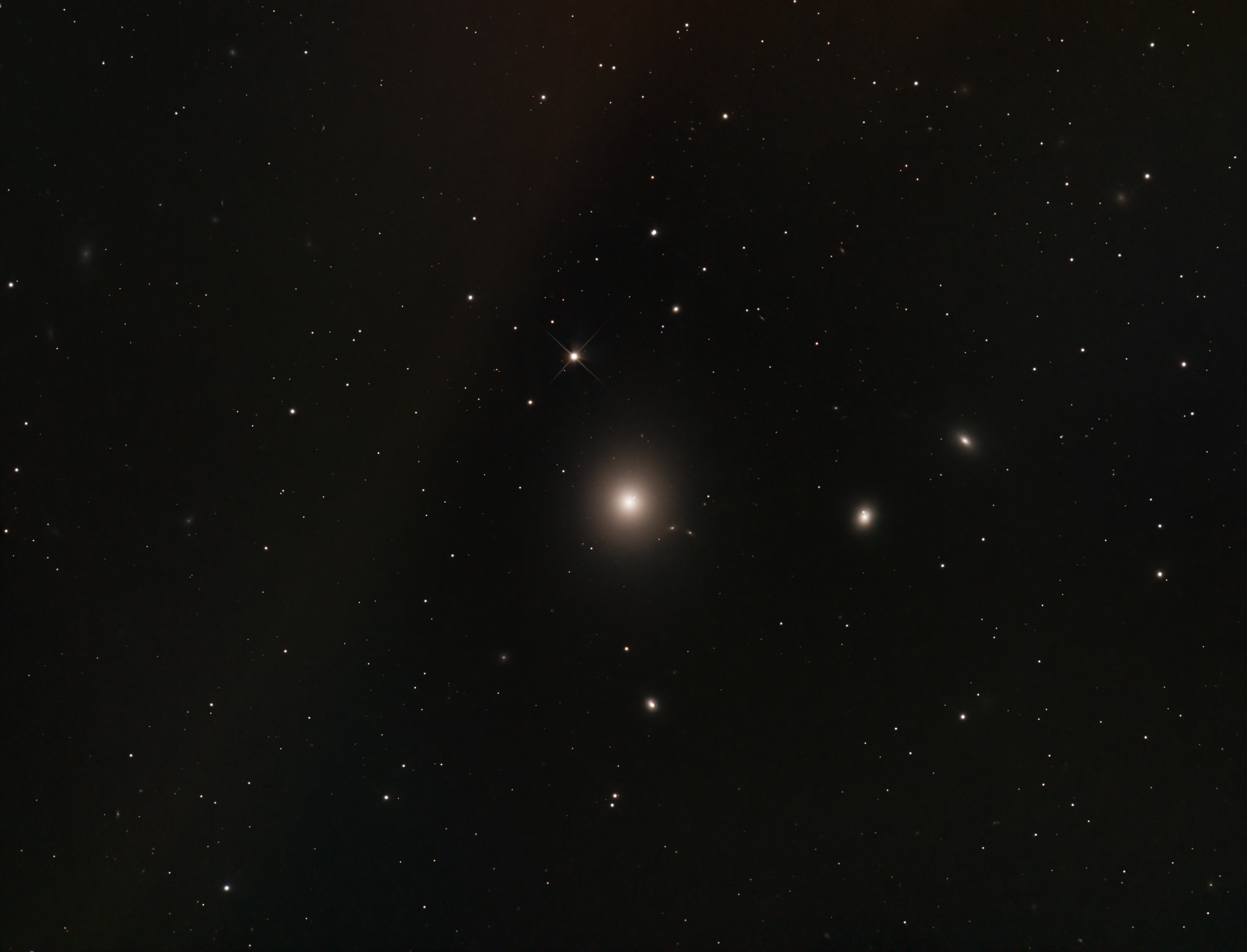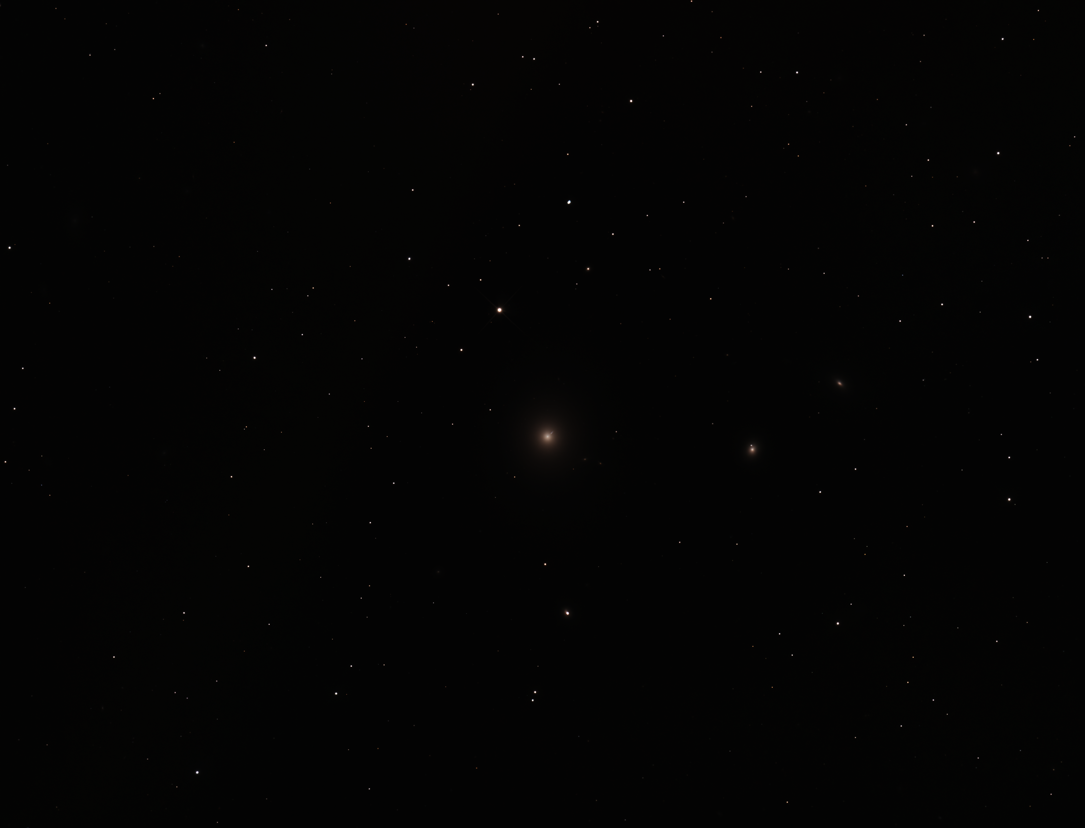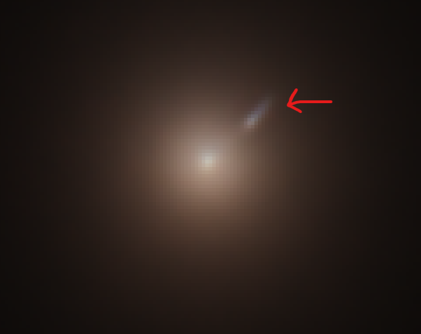 This image shows the giant elliptical galaxy Messier 87, located about 55 million light-years away in the Virgo Cluster. At the heart of M87 lies a supermassive black hole, one of the most massive known, which powers a spectacular relativistic jet — visible here as a faint blue streak emerging from the galactic core (highlighted by the red arrow).